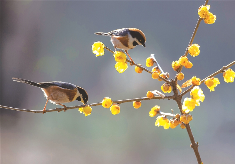| 图为江苏无锡梅园,小鸟在蜡梅枝头嬉戏。新华社发 |