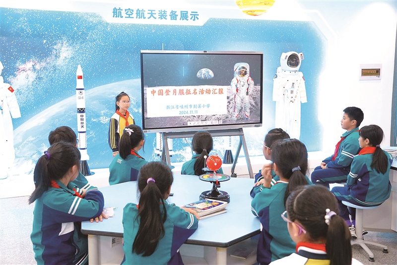 | 图为浙江省科学教育实验校嵊州市剡溪小学的学生们介绍自己设计的登月航天服。(作者供图) |