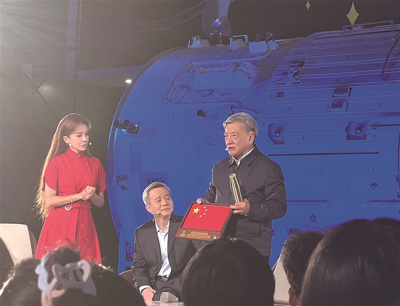 | 图为“2025·出发”科学文化跨年演讲,刘嘉麒院士介绍嫦娥六号在月球展示的“玄武岩”材质的国旗。 刘莉 摄 |