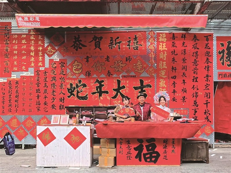 | 临近新年,市民游客来到广东佛山挥春街打卡拍照,邀请书法老师题写对联,现场满是新春的热闹与温情。视觉中国供图 |