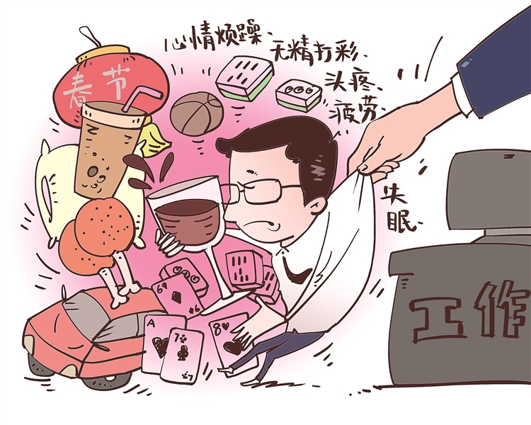 “节后综合征”是人们在假期之后出现的各种生理或心理的表现。如在节后的两三天里感觉厌倦,提不起精神,上班的工作效率低,甚至有不明原因的恶心、眩晕、肠道反应等。