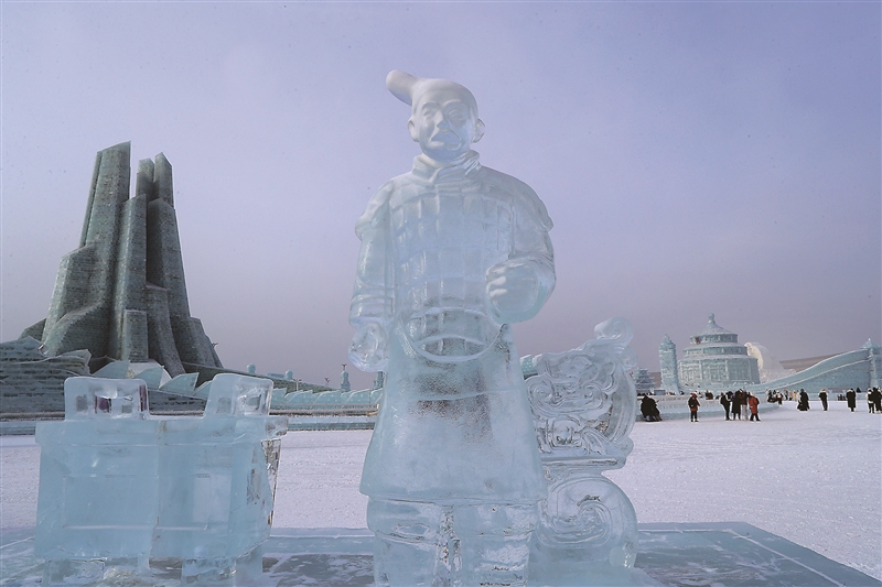 | 图为1月26日,哈尔滨冰雪大世界的立射俑冰雕。 季春红 摄 |