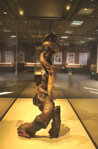 浸泡于玻璃瓶中的蛇、缠绕在“树干”上的蛇、“扬首疾行”的蛇,细密的蛇骨骼……近50件精挑细选的珍稀蛇类标本,类型丰富、姿态自然、做工精致,加深了人们对蛇类演化、结构特征、行为习性、种类分布等知识的印象。