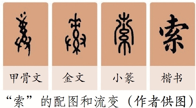 绳索很长,我们沿着绳索,能找到它发端的地方,也就是“头儿”,因此“索”有搜求、寻找、探寻的意思,比如“搜索”“探索”。有个成语叫“按图索骥”,说的是古代有一位相马专家叫伯乐,写了一本《相马经》,在里面详细描述了千里马的特征。伯乐的儿子拿着《相马经》,根据描述去寻找千里马的故事。“按图索骥”中的“索”,就是寻找、寻访的意思。后来,“索”由寻找、搜寻进一步引申为强行要,比如“索要”“勒索”等。