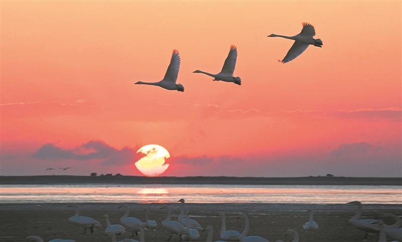 每年,上万只大天鹅会从西伯利亚等地迁徙到山东荣成越冬,2月底回迁。大天鹅又称黄嘴天鹅,是世界上飞得最高的鸟类之一,主要分布于中国、俄罗斯的西伯利亚。图为2月24日日出时分,大天鹅在山东省荣成市天鹅湖畔飞舞、休憩。新华社发 杨志礼 摄