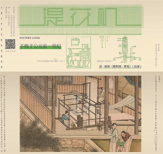 三国时期,机械制造家马钧改进提花机,将原需50-60蹑的机器简化为12蹑,大幅提升了效率。唐宋时期,提花机进一步发展可织出更复杂的纹样,如唐代的“陵阳公样”和宋代的重锦、缂(kè)丝,均依赖提花技术实现。元代棉纺织家黄道婆将提花技术应用于棉布,推动了江南棉纺织业的发展。明代宋应星在《天工开物》中,有关于提花机式与全图的详细记载。提花机的发展顶峰是大花楼机,大花楼机可以织造花纹循环极大的织物,比如龙袍一类的袍料,循环达10米。《天工开物》上篇则详细描绘了提花机的结构,其核心是“花楼”装置:由两个人配合操作,一个人负责提拉“花本”,另一个人投梭织纬,实现“一纵一横、千变万化”的图案。