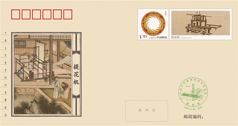 | 图①: 成都老官山汉墓出土的提花机复原图。(作者供图) 图②③: “提花机”纪念封及内插页。 (中国集邮有限公司供图) 图④: “丝”篆刻章。(马国馨院士 刻) |