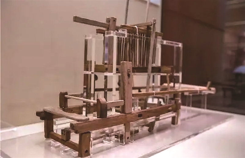 随着丝绸需求的增长,战国时期至汉代的提花机逐渐成熟。东汉王逸在《机妇赋》中这样描述提花机:“方圆绮错,极妙穷奇,虫禽品兽,物有其宜。兔耳跧(quán)伏,若安若危。猛犬相守,窜身匿蹄。高楼双峙,下临清池。游鱼衔饵,瀺灂(chánzhuó)其陂(bēi)。鹿卢并起,纤缴俱垂。宛若星图,屈伸推移。一往一来,匪劳匪疲。”该提花机通过脚踏控制经线分层,配合提综装置形成花纹。