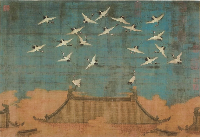 宋徽宗《瑞鹤图》现存于辽宁省博物馆,画中20只白鹤以17种飞行姿态环绕汴梁宣德门,题跋记载此为政和二年(1112年)正月十六的祥瑞事件。