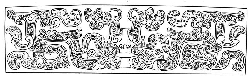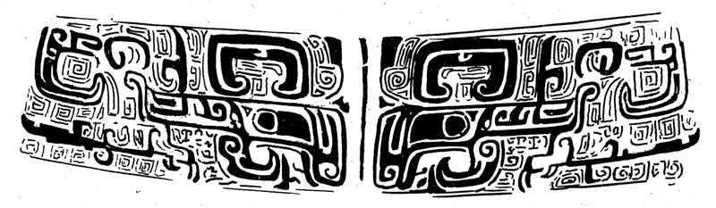龙纹是一种兽头蛇身的纹饰,头部类似鳄鱼,大口巨嘴,头上长角,身体类似蛇躯而作几何状的回形屈曲,体上饰以回旋纹并作二方连续状。天元鼎小鼎,就是借鉴了商代龙纹扁足鼎的礼器特征。
