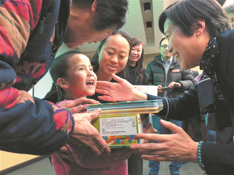 | 2018年2月11日,全国政协委员、时任中国听力语言康复研究中心主任龙墨(右一)向听障儿童赠送康复用具。 |
