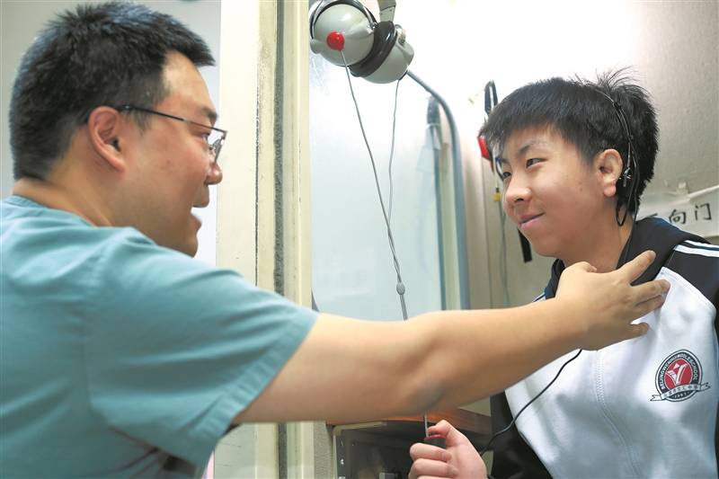 | 2025年2月26日,北京友谊医院,听力医师为骨传导助听器佩戴者评估适配。 |