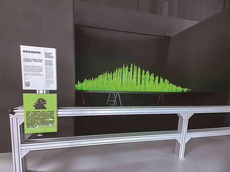例如,展品“世界终结的开始”就反思了核与暴力问题。作品选用铀玻璃材质,在自然光下呈现静谧的翡翠绿,隐喻和平;但在紫光灯照射下,却呈现诡异的荧光绿,令人生畏。作品将美丽与危险熔铸于同一载体,极具张力,暗示核危机对人类文明构成的永恒威胁。