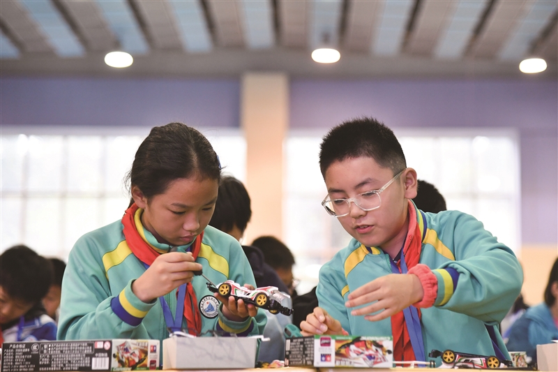 | 图为学生在西安市新城区太华路小学参加车辆模型挑战赛。 新华社记者 张博文 摄 |