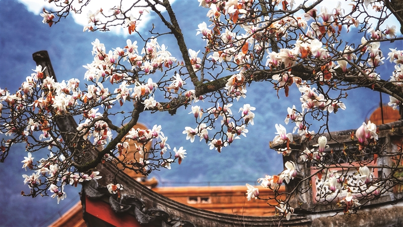 | 图为杭州天目山下,百年玉兰绽放。 倪云 摄 |