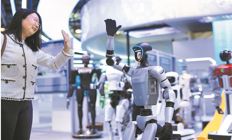 3月27日,2025中关村论坛年会在北京开幕。应用于迎宾、交流、主持、表演、服务等场景的百余台人形机器人活跃在各个角落,成为论坛年会的一大看点。图为现场观众正在跟机器人互动。 科普时报记者 季春红 摄