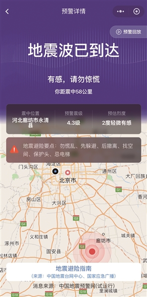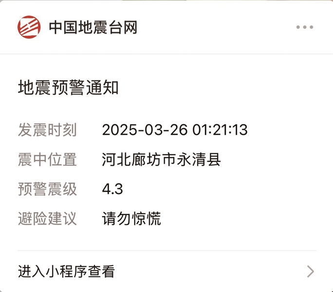 3月26日凌晨,河北省廊坊市永清县发生4.2级地震,河北、北京等地“震感明显”。不少人被手机地震预警叫醒。