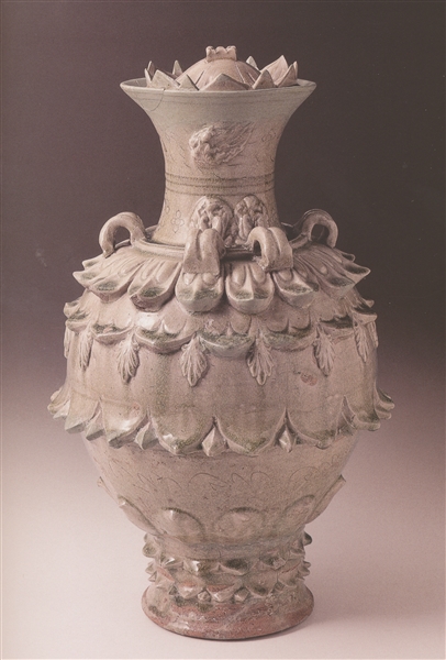 学术界关于莲花尊的烧造地不详,南北方均有出土。从湖北武昌、河北磁县等地出土的30多件莲花尊中,最为著名的当属河北景县封氏墓出土的青釉莲花尊——据出土纪年墓所载,其烧造年代应在公元5世纪中期至6世纪末,横跨六朝和隋代,当时为什么会涌现出这一独特造型器物?这与六朝佛教广泛传播有关。