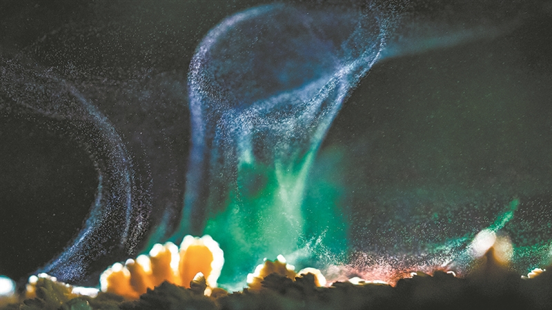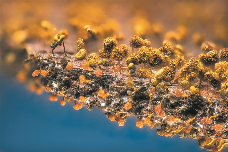 | 图①: 随着黏菌的生长,孢子发育成熟伺机喷发(微距堆栈图,即同一拍摄条件下,多次曝光合成图片)。 图②: 黄褐锥鳞鹅膏。 图③: 蘑菇孢子喷发。周勇 摄 |