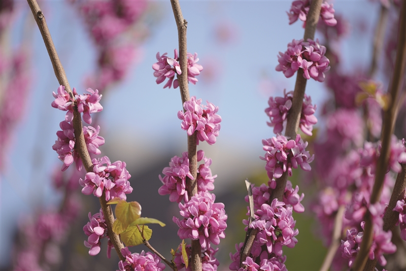 北京的四月,百花盛开、万紫千红。在桃花、李花、海棠花和樱花等一众花卉里,紫荆花显得格外特别。它们色泽鲜艳,呈紫红色,花朵小巧,好似一只只灵动的蝴蝶,十余朵紧紧簇生在一起。紫荆花最奇特的地方,在于它开花没有固定位置,上至枝顶,下至根部,都能绽放花朵。尤其是主干和老枝,常常被密密麻麻的花朵包裹,看起来极为醒目,因此,紫荆又有“满条红”和“老茎生花”的美称。