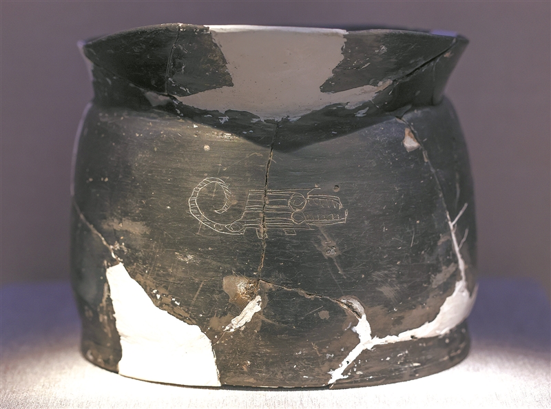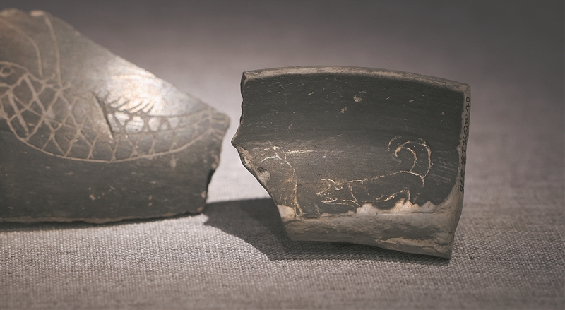 | 图①: 杭州市余杭区南湖遗址出土的陶罐上,形似奔跑的“老虎”刻符,像极了甲骨文中的虎字。 图②: 杭州市余杭区茅庵里遗址出土的陶片上,刻画了一只小狗。 图③: 杭州市余杭区葡萄畈遗址出土的陶刻纹宽把杯上,扬子鳄的爪牙清晰可见。 科普时报记者 季春红 摄 |