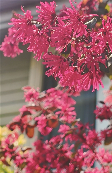这种植物叫作红花檵(jì)木。“檵”字,是专为这种植物量身而设的名字,以纷繁的笔画勾勒其独特花姿,尤其像花未绽放时,几朵花苞簇着,四片花瓣蜷缩缠绕,蓄势待发。待到花开,带状的花瓣四散而出,每一缕都朝着自己的方向自在舒展,每一朵都“唱”出了自己的旋律。它不像寻常花朵那样规整,而是灵动鲜活,轻盈自由,如同一朵朵烟花被定格在枝头,将生命的跃动织入春日的午后。