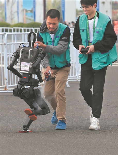 | 60903号“夸父”摔倒后,参赛队工程师在现场紧急“施救”。 |