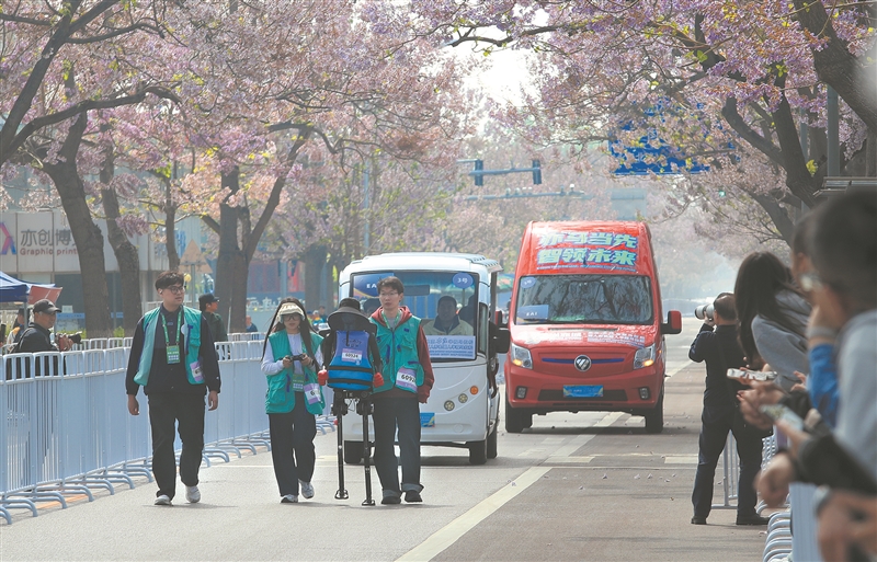 | “行者二号”行进在泡桐花开的赛道上,它的体重较轻,只有30公斤,能实现6小时的动态续航。 |