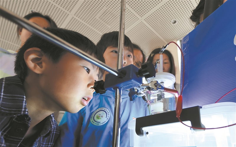 | 小朋友们在中国科学院化学研究所“纳米裂水匠”展台前,观看光电解水产氢装置。 |