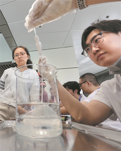 | 观众在中国科学院化学研究所“分子裁缝——尼龙的故事”展台前,观看尼龙材料的界面聚合实验。 |