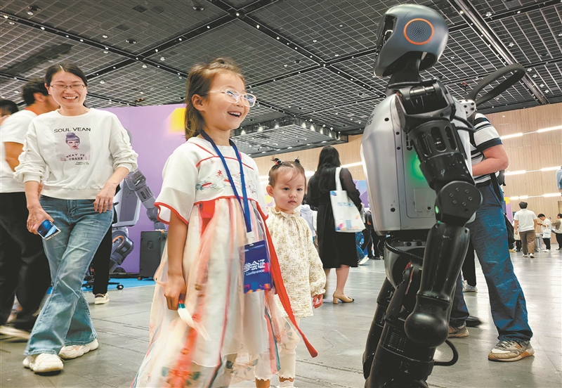 5月29日,2025张江具身智能开发者大会暨国际人形机器人技能大赛在上海张江科学会堂启动,60余支队伍在9个比赛场地展开激烈角逐。图为小观众与加速进化人形机器人互动。视觉中国供图