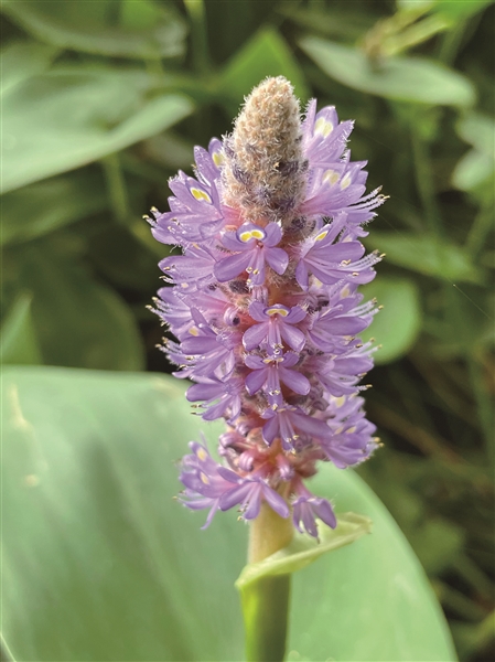 盛夏时节,漫步池塘边,蓝紫的梭鱼草花仿佛具有一种魔力,格外引人注目。与荷花、睡莲艳丽的大花朵相比,梭鱼草的花朵小而密集。远看,它们就像一把把蓝紫色的瓶刷,挺立于心形的大叶子间,散发着独特的韵味,让人忍不住想走近细看。