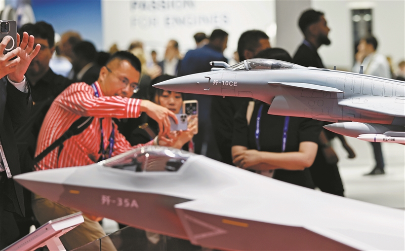 6月16日开幕的第55届巴黎航展,吸引了来自48个国家和地区的近2400家参展商参展。创始于1909年的巴黎航展是世界上规模最大和最负盛名的国际航空航天展会之一。图为6月17日,人们在中国航空工业集团展台参观歼-35A、歼-10CE等模型。新华社记者 高静 摄