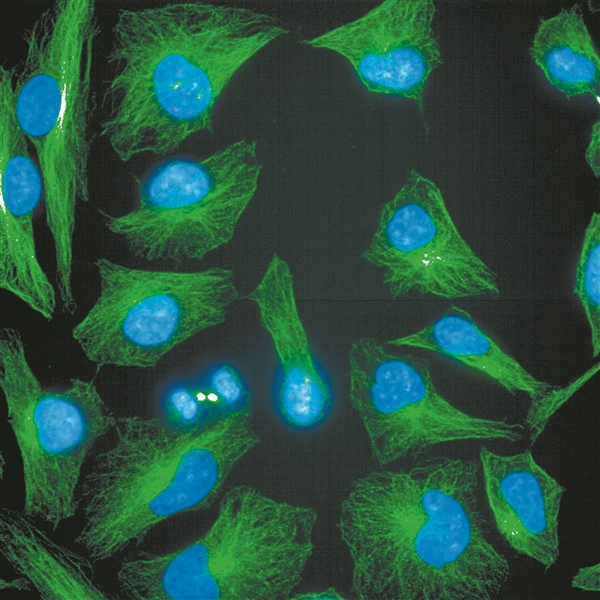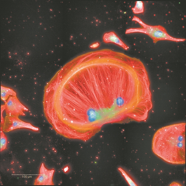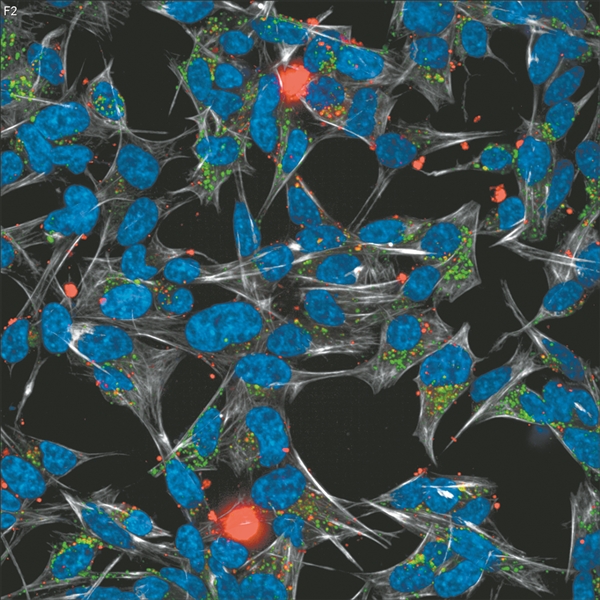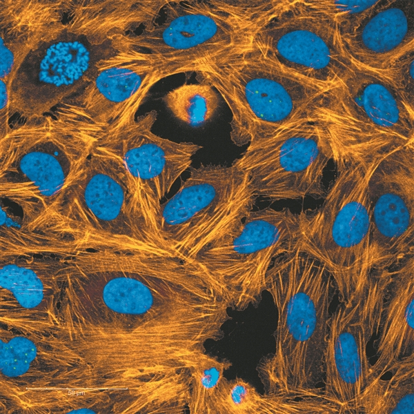 | 图①: 肿瘤细胞(蓝色为细胞核,金色为细胞骨架)。 图②: 帕金森病研究的细胞实验(蓝色为细胞核,绿色为溶酶体,红色为帕金森病特征蛋白)。 图③: 成熟的猴肾细胞(蓝色为细胞核,橙色、红色为细胞骨架)。 图④: 用荧光染料标记的细胞、细胞核(蓝色)、线粒体(红色)。 图⑤: 用荧光染料标记的细胞(中间偏左下有一个处于分裂末期的细胞)。 (作者供图) |