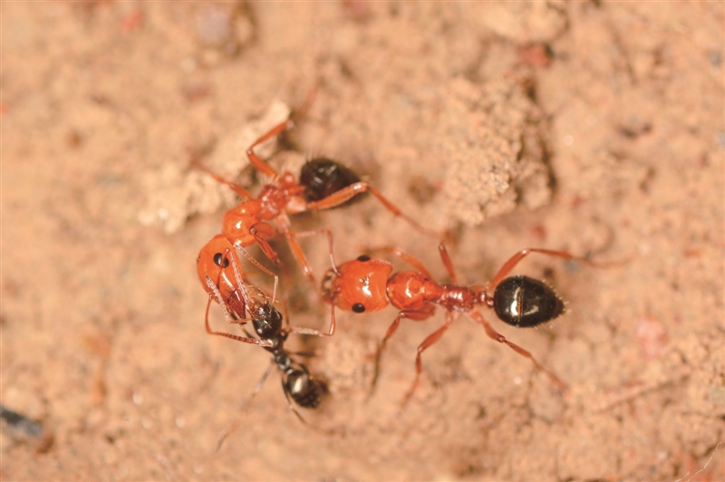 在有些蚂蚁群体中,社会的复杂度不是增加了,反而是降低了,比如社会性寄生的蚂蚁。其中,最出名的莫过于堪称“最强奴隶主”的悍蚁。这类蚂蚁不挖穴、不觅食、不照顾幼虫,靠掠夺其他蚂蚁为生。当它们锁定目标蚁群后,工蚁会倾巢而出,冲入对方巢穴,然后用镰刀般锋利的上颚刺穿反抗者,再将对方的后代带回家,等其羽化为成虫后,新晋工蚁会完全将悍蚁当成自己的同伴,持续工作直至死亡。