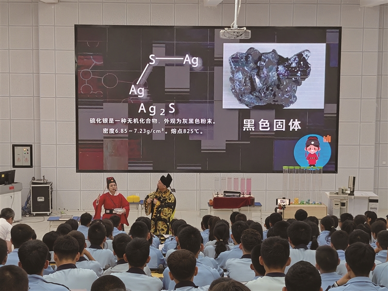 故事一开始,同学们就看到包拯、展昭正在断案,“银针试毒”这一古装剧必备桥段不出意外地出现在这里。扮演展昭的广州海关团队成员邹淑敏解释:“银针试毒是古代基于银与砒霜(常与硫化物伴生)反应的检测原理,而发明的食品安全筛查方法。”银与硫化物反应会生成黑色硫化银,使银针变黑。但是,这种方法有局限,仅对含硫毒物有效,并不是科学的验毒手段。