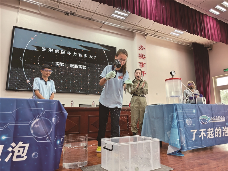 | 图为山东科技馆团队带来《了不起的“泡泡”》科学实验,带领学生们感受液体里突然出现的“气泡”——空泡的破坏力。 |