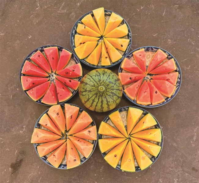“五色三味”西瓜不仅有利于人们消暑解渴,其高颜值更是彰显了现代科技的魅力——外观与果肉的多样化搭配。“五色”,指红、黄、绿、黑、橙等不同颜色的果皮与果肉组合,如“炫彩2号”的橙黄肉、“炫彩8号”的黄皮红肉等,这些色彩缤纷的搭配让人眼前一亮。此外,独具个性的豹纹瓜也闪亮登场,为消费者提供了更多选择。“三味”,则指西瓜的甜味、风味和口感——甜度高达13%-15%(普通西瓜约为10%-12%),风味性物质含量提升25%,果肉兼具半沙半脆的质地,带来层次分明的味觉享受。