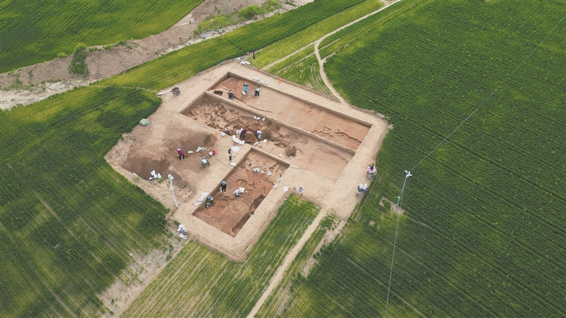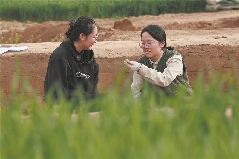 | 4月2日,河南省新郑市,麦田中的裴李岗遗址发掘现场。 本版图片除署名外均由聂冬晗摄 |