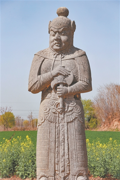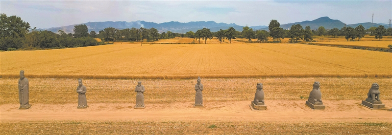 | 6月6日,矗立于麦田周围的宋陵石像生,犹如“麦田守望者”。 |