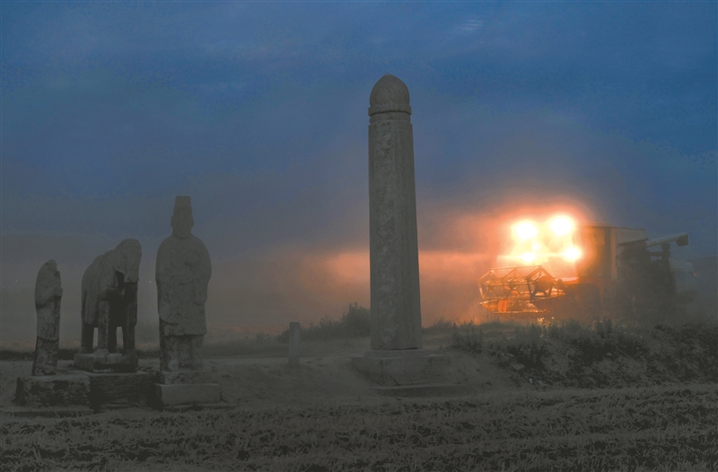 | 6月4日,河南省巩义市宋陵遗址保护区永熙后陵,夜幕下收割机展开抢收,尘土与灯光交汇,空灵感十足。陈晓东 摄 |