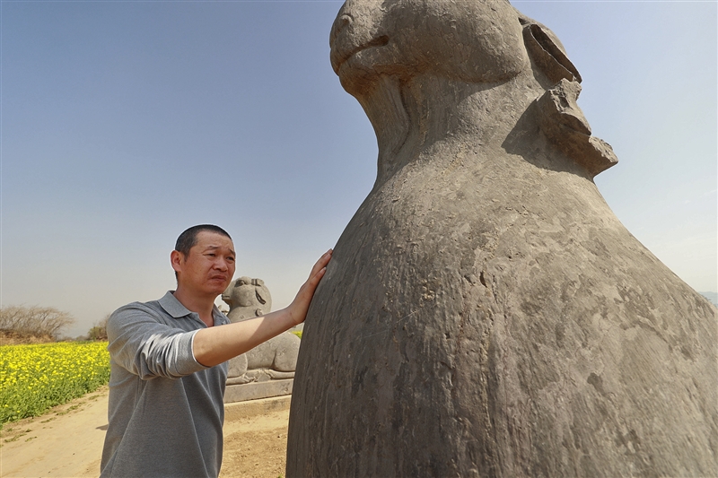 | 3月25日,郑州市文物局宋陵保护所工作人员在观察记录石像生。 |