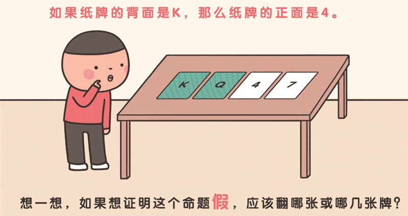 如果仔细观察,就会发现,这个例子中的K、Q、4、7刚好依次对应了p真、p假、q真、q假四种情况。而如果想验证“如果纸牌的背面是K,那么纸牌的正面是4”这句话为假,只需找到纸牌背面是K(p真),但纸牌正面不是4(q假)的情况。