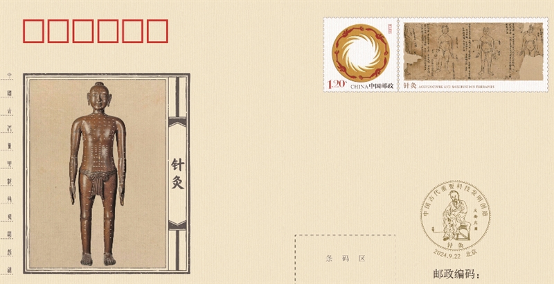 | 图①②: “针灸”纪念封内插页及封面。 (中国集邮有限公司供图) 图③: “针灸”篆刻章。 (马国馨院士 刻) |