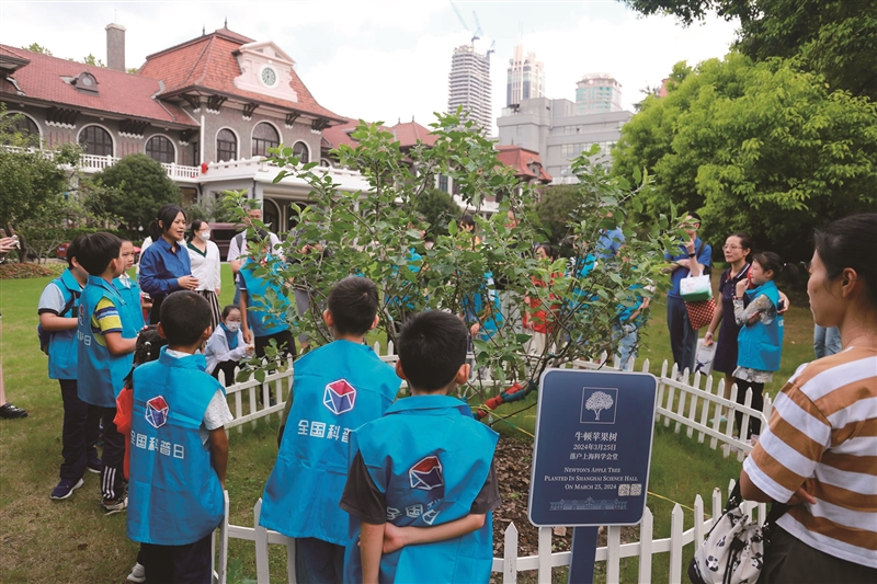 在1号楼门前的花园东北角,种着一棵特殊的苹果树——牛顿苹果树,它是由传说中掉下苹果,砸到牛顿,从而启发他发现“万有引力定律”的那棵苹果树的枝条扦插嫁接而来,于2024年3月25日落户上海科学会堂。“这棵树是引进的英国国家级文物,为的是让来参观的孩子们更直观地‘看到’‘牛顿的科学探索精神’”。龚艳萍说。