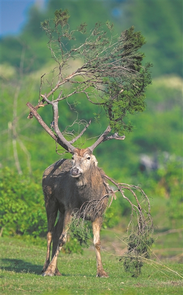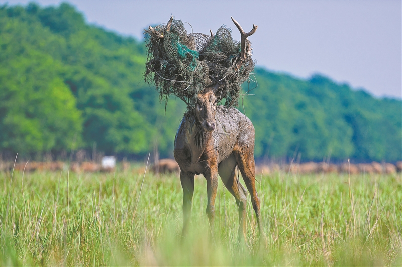 | 图①: 夕阳下,归途中的雄性麋鹿。图②: 废弃渔网盘出别样的“美”。 图③: 松枝装扮的雄性麋鹿略显“傲气”。孙华金 摄 |