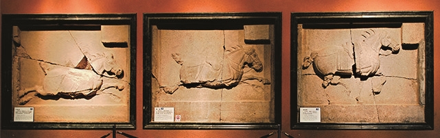 | “昭陵六骏”采用高浮雕的形式将六匹骏马生动地再现在石板上,图为其中的“特勤骠”“青骓”“什伐赤”。 (图源:西安碑林博物馆网站) |