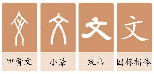 到了小篆的字形中,花纹的形状被省去了。这种情况延续到了后来的隶书、楷书、行书和草书中,但是书写更加简便,符号性变强,已经很难看出字形跟人胸部上的花纹有什么关系了。