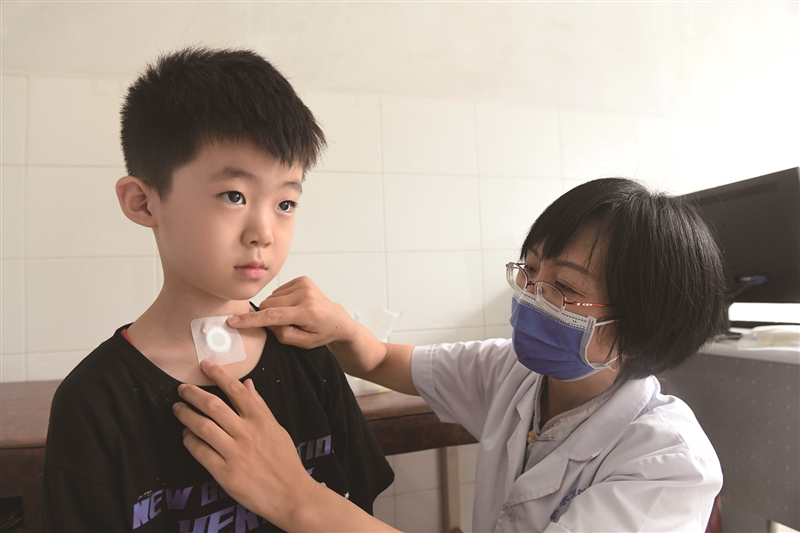 | 河北省石家庄新乐市中医院医务人员给儿童贴“三伏贴”。新华社发 贾敏杰 摄 |
