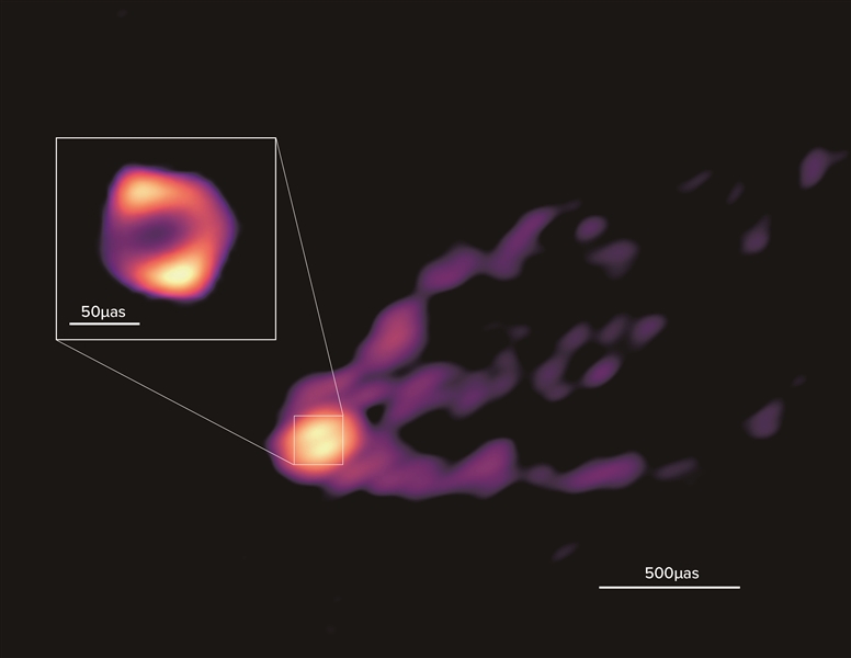 | 图为M87黑洞阴影、吸积流和喷流一起成像的全景图(中国科学院上海天文台供图)。新华社发 |